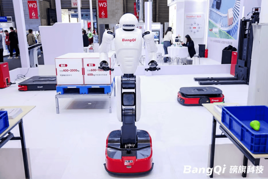 ·具身智能机器人:磅旗自研,以 “拓展人类边界”为设计核心,堪称工业场景的 “全能操作者”:配备双7自由度机械臂与双灵巧手,可完成货到人拣选、仓库内搬运、无人拆码垛、订单分拣与包装、AI质检、巡检、自动盘点等复杂任务。