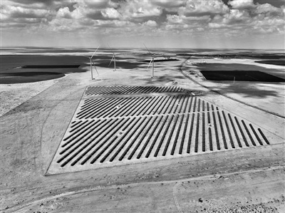 盛夏的苏尼特右旗,天空湛蓝深远,云朵洁白无瑕。蓝天白云下,一排排太阳能光伏板整齐排列、连线成片,被阳光照射得熠熠生辉。牛羊马驼悠然游走,成为辽阔草原上的亮丽风景线。