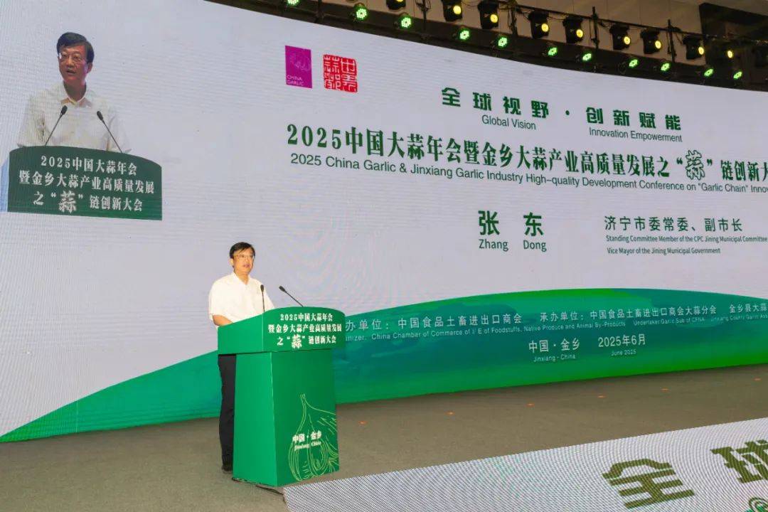 张东在致辞中说,全链思维是产业融合的关键,科技创新是产业发展的动力。今天我们以蒜为媒,搭建了合作交流的广阔平台,是一场群英毕至的“蒜”界盛会,也是一次面向未来的创新之约。济宁市将一如既往地关注和支持金乡大蒜产业的发展,为产业发展提供坚实政策保障和良好发展环境。希望金乡充分发挥自身优势,以全链思维促进产业融合,在更大范围、更高层次加强交流与合作,实现互惠互利、共赢发展,谱写新时代大蒜产业高质量发展的新篇章。希望大家继续关心金乡,为金乡大蒜产业的发展出谋划策、传经送宝,共同推动金乡大蒜产业高质量发展再上新台阶。